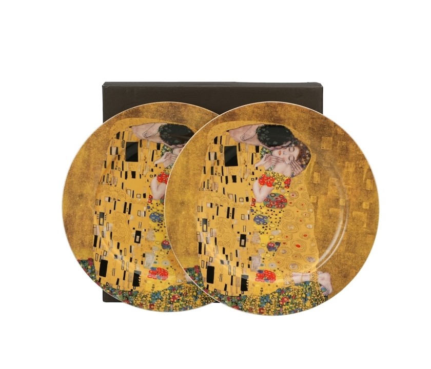 مجموعه ای از دو بشقاب دسر بوسه با الهام از کلیمت از مجموعه گالری هنر. این محصولات از چینی نیوبون چین ساخته شده اند، ماده ای که به دلیل دوام عالی و ظاهری براق و کرمی مایل به سفید شناخته شده است.