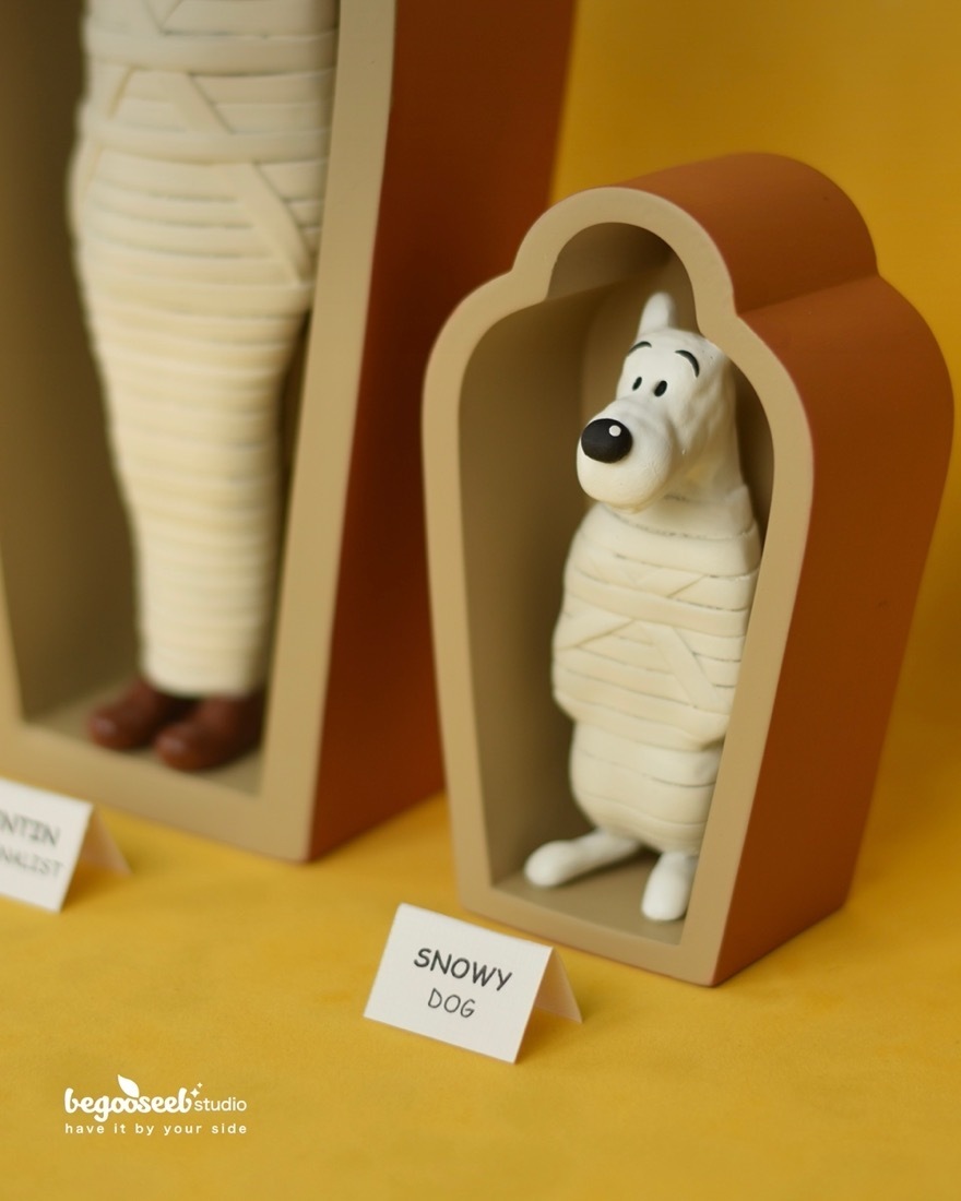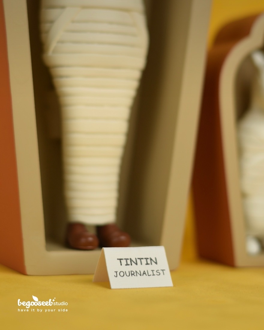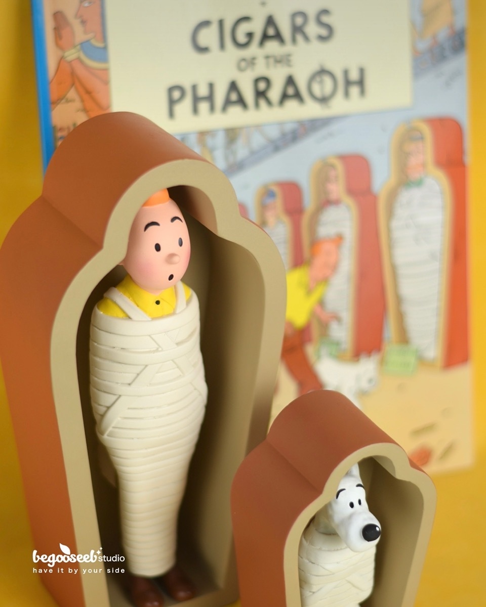 فیگور تن تن و میلو مومیایی در تابوت، با الهام از داستان سیگارهای فرعون، یکی از آثار منحصر به فرد بگوسیب است که به دنیای شگفتانگیز تن تن و ماجراجوییهایش جان میبخشد. این فیگور بر اساس صفحه ۸ و ۹ کتاب طراحی و ساخته شده.